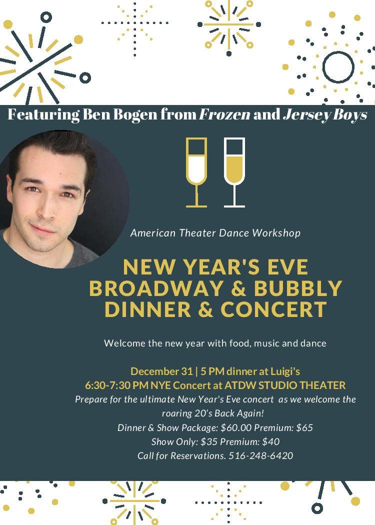 We are proud to announce our *New Year's Eve Broadway & Bubbly Dinner & Concert* on December 31st featuring* Ben Bogen from Frozen and Jersey Boys*! The evening will begin at 5:00 PM with dinner and champagne at Luigi's Pizzeria, right around the corner from ATDW at 562 Jericho Turnpike. At 6:30 PM, we'll move over to the ATDW Studio Theater for an hour of music, dance, and celebration! Tickets can be purchased over the phone at 248-6420, in the office at the studio, or online using the links below. Make sure you click the link for the correct type of ticket you wish to purchase! Please note that you will need to charge each ticket individually.