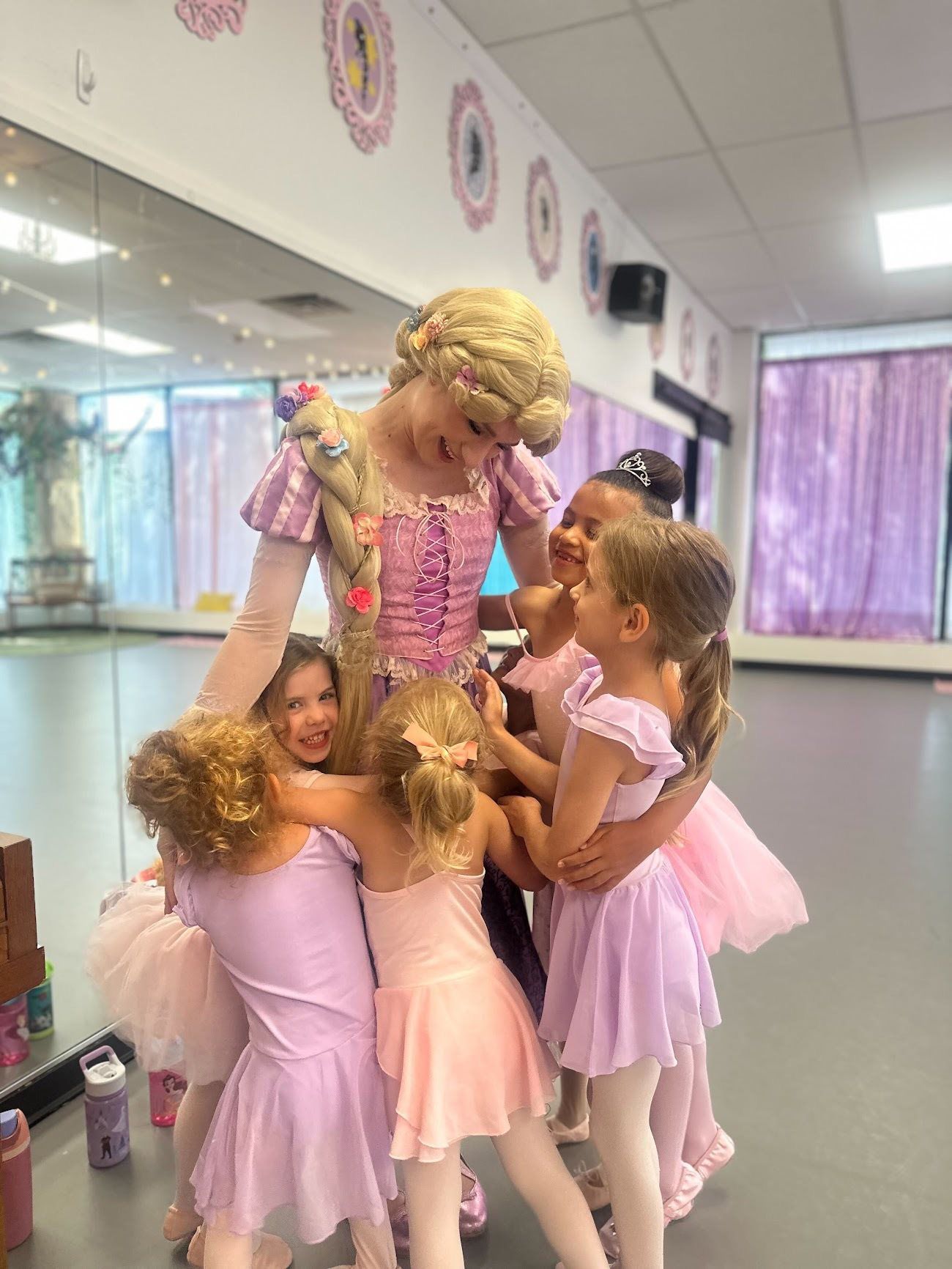 What does our camp look like? The first hour consists of a dance class in ballet and theater dance. The second hour is filled with a fun visit from a Princess or Character, crafts, story time & parents can take a Photo with our